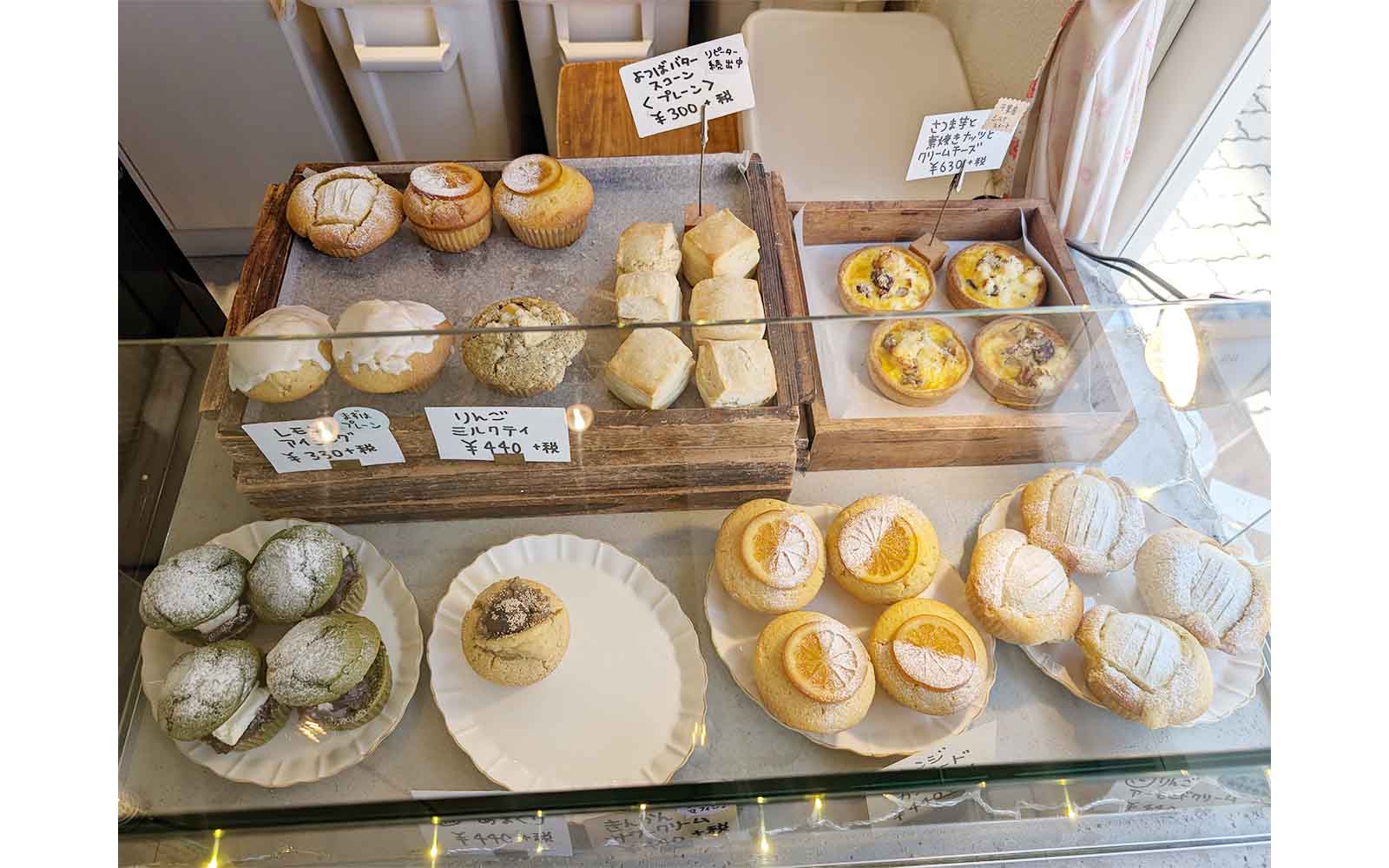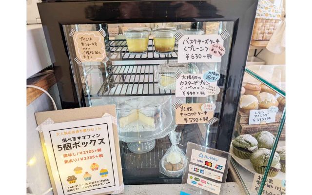 マフィン各種、米粉バスクチーズケーキ、米粉キャロットケーキ、太陽卵カスタードプリン、よつ葉バタースコーン、自家製キッシュなどここに注目!取材者のお勧めポイント